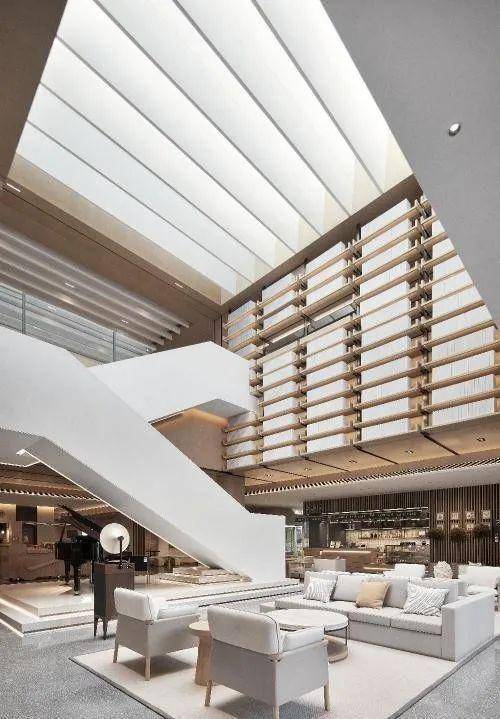 回字形的空间,与社区下沉式广场相连,透过大大的落地窗,不仅部分实现了自然采光,也让窗外的景致可以直沁人心。