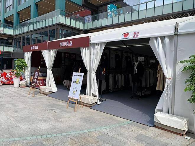 零售品牌部分则较为杂乱,除了荟品仓、宝岛眼镜、华为,其他多为服饰工厂店以及特卖店,店铺内未进行精装修,招牌也少有见,广场中庭还有一个搭建的“无印良品”简易棚,国际知名品牌暂处于空缺中,快时尚、国内一二线服饰鞋靴等品牌也未有见。