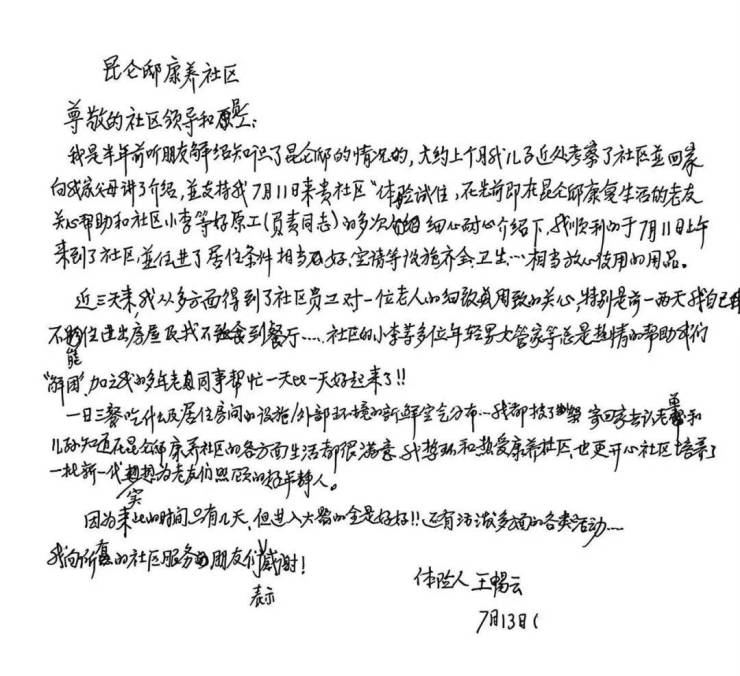 “这里的年轻人比自家孩子还贴心!” 近日,昆仑邸康养社区收到了一封手写表扬信,72 岁的王老师用朴实的文字,写下了在社区 3 天试住的暖心体验。