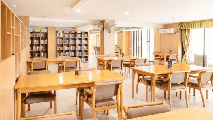 公共区域占比超60%,构建“三层立体活动空间”:地面层1200平方米康复大厅配备有创呼吸机、心电监护仪等急救设备,与中山大学附属肿瘤医院共建肿瘤康复中心;空中层3000平方米空中花园设无障碍步道、适老化健身器材及药用植物种植区,年均组织芳香疗法课程超150场;地下层6000平方米人防设施改造为文化娱乐中心,包含智能投影卡拉OK室、书画阅览室、棋牌室等,日均举办书法班、园艺班等活动超3场。此外,机构还设有1200平方米的多媒体室,含智能投影、卡拉OK系统,满足长者多样化的娱乐需求。