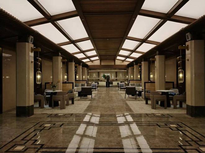 通过优化后的“L型”空间排布,实现了三面有园林环绕,前庭空间尺度非常大,一进门就是约10.2米的大横厅,气派十足,采光也做到极致,日常起居极为从容舒适。