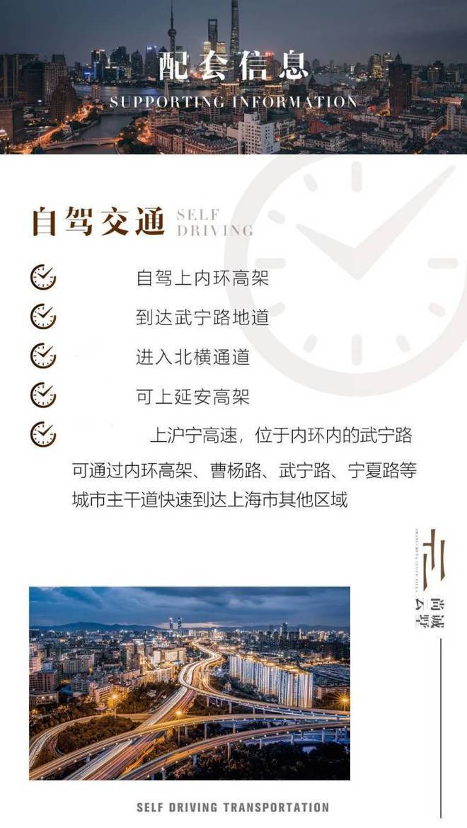 自驾上内环高架、到达武宁路地道,进入北横通道、可上延安高架、上沪宁高速。通往上海各个区域乃至出市区都极为便利。