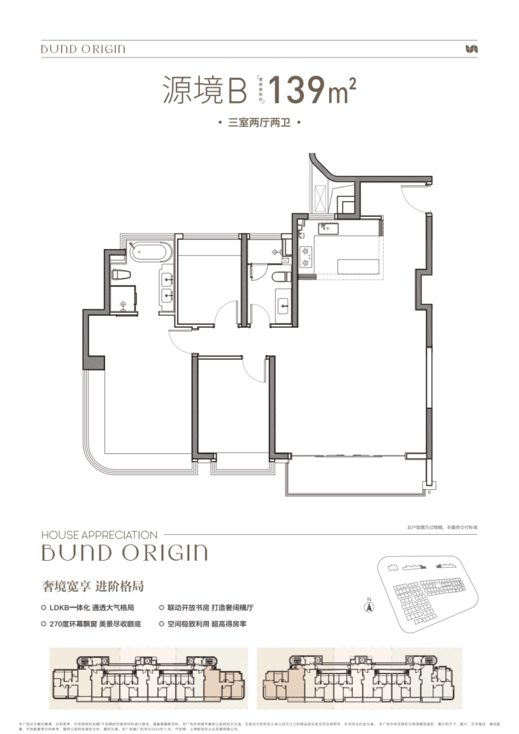 大横厅设计,3房2厅2卫格局,三开间朝南+LDKB一体化+奢阔宽厅+全卧室带飘窗+主卧套房设计+动静分离+主卧270度飘窗+弧形飘窗,舒适度更高。