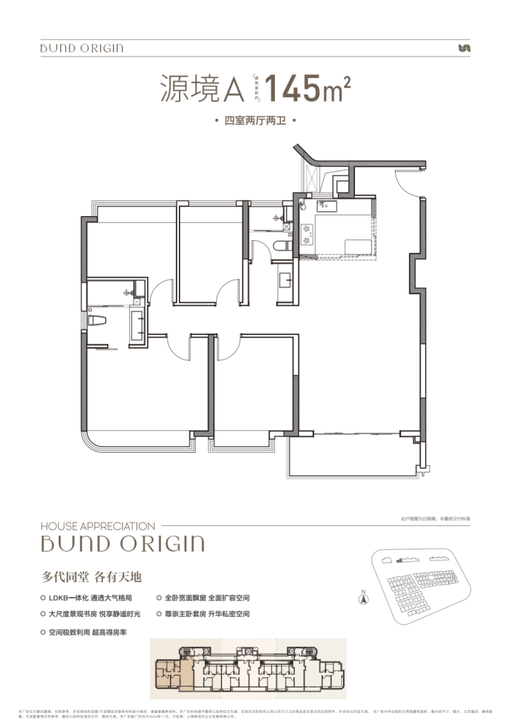 4房2厅2卫格局,三开间朝南+LDKB一体化+全卧室带飘窗+主卧套房设计+动静分离,居住功能性更强。