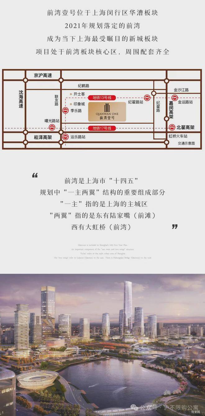 前湾壹号坐落于上海市闵行区华漕镇联友路88弄,地处虹桥国际开放枢纽核心承载区,毗邻苏州河入沪第一湾。项目由招商蛇口、保利发展、万科等知名房企联合打造,总建筑面积约68.3万平方米,涵盖高层住宅、顶奢大平层及写字楼,产权年限为50年商办产权,不限购、不限贷。