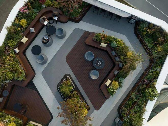 拾阶而上,来到“悦·空间”的主题露台。通过悦食、悦闲、悦趣、悦享、悦厅五个大小、功能各不相同的主题空间,不仅是商务交流的平台,更是企业休闲的乐园,在这里,人们可以举办会议茶歇,品尝户外烧烤美食,观赏露台上的电影,展开人际交流与合作。屋顶空中花园与首层私属花园相互呼应,共同构建起立体生态健康办公的模式。在这里工作的人们不仅能够享受到自然带来的舒适与愉悦,更能够将工作与生活完美融合,创造出富有活力和创造力的工作环境。