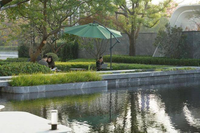 洽谈区掩映在绣球花径与娜塔栎的树影婆娑之中,水系环绕,背靠浓密的植物背景,打造静谧的户外会客空间,将人们带入一个诗意与雅致并存的境地。悬浮于水面的苔藓案台,从远处的水景一直延伸到会客区中央,与潺潺涌泉、天然置石、雅致植物相结合,如精致盆景一般的微观山水,展现山水美学的精髓和品味。一抹浮苔,将会客区的视线引向远处的景观,营造疏朗惬意相互渗透的空间。