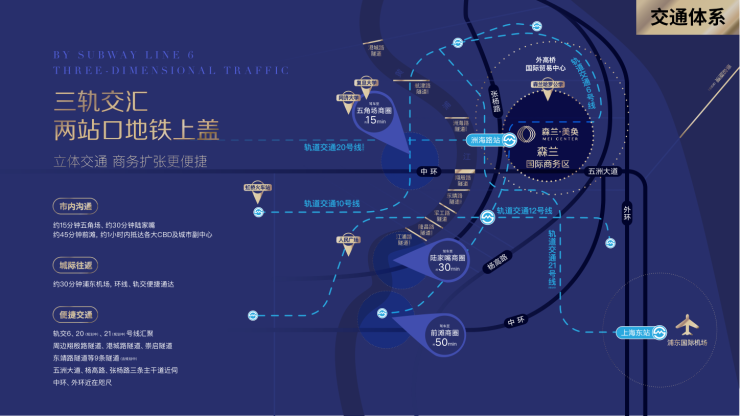 浦东商务主脉——前滩商务区、陆家嘴金融中心、森兰国际商务区,森兰美奂位居商务区核心位置金色中环名片——森兰美奂位居浦东十四五规划的金色中环带东门户位置浦东十四五发展重心——十四五规划中,浦东重点规划打造“金色中环发展轴”、“洲海路商务发展轴”,森兰美奂地处洲海路商务发展轴核心