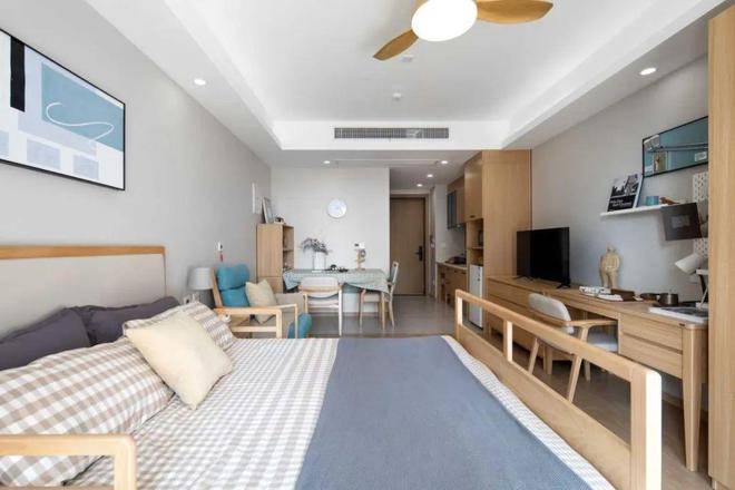 房间均为南向,精装修,配备全套家具、家电。室内整体采用原木色设计,布置很温馨。