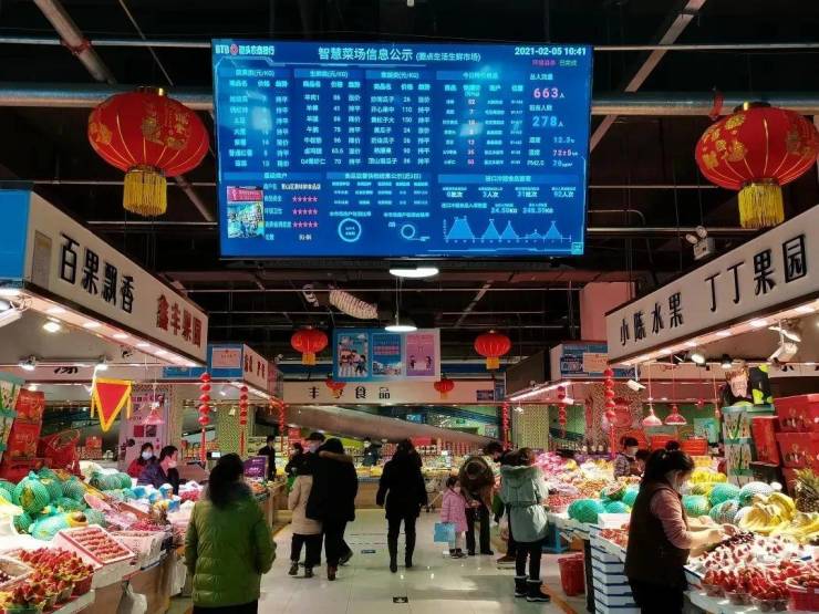 走进青山区“智慧菜场”--圈点生活生鲜市场,首先映入眼帘的是“智慧菜场”入口处,硕大的电子显示屏,电子屏幕上不仅能看到市场当日各类蔬菜的价格指数、特价商品、人流统计等信息,还能展示菜品、冷链食品的来源和食品快检结果等信息,消费者只需通过智慧电子屏,就能“数读”整个市场的情况。