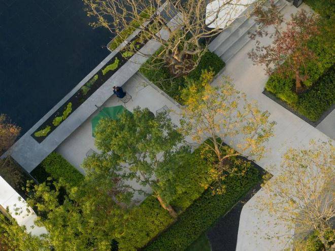 洽谈区掩映在绣球花径与娜塔栎的树影婆娑之中,水系环绕,背靠浓密的植物背景,打造静谧的户外会客空间,将人们带入一个诗意与雅致并存的境地。悬浮于水面的苔藓案台,从远处的水景一直延伸到会客区中央,与潺潺涌泉、天然置石、雅致植物相结合,如精致盆景一般的微观山水,展现山水美学的精髓和品味。一抹浮苔,将会客区的视线引向远处的景观,营造疏朗惬意相互渗透的空间。