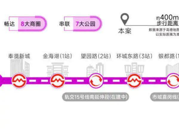 轨交网络:5号线、15号线南延伸段(在建中)、市域嘉闵线南延伸段﹙规划中﹚、市域奉贤线(规划中)及南枫线(在建中)