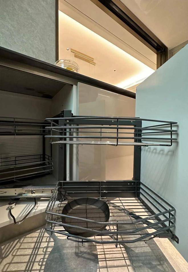 下方的橱柜则做了转角拉篮,充分利用转角空间,使物品井然有序的同时,轻松方便取放。