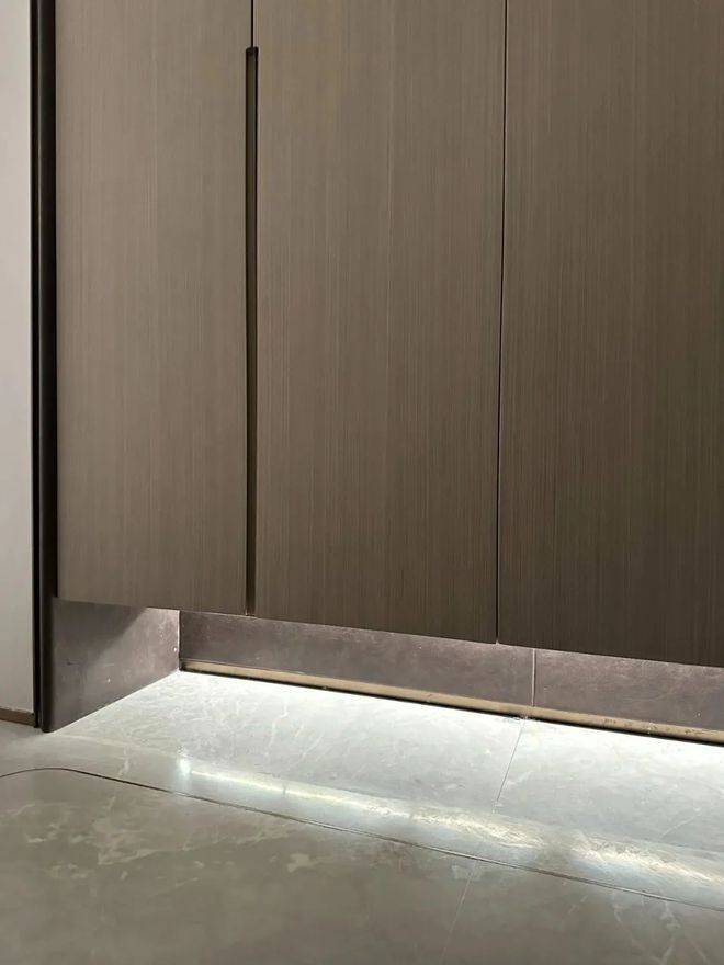 鞋柜下方做了悬浮处理,同样也是内嵌灯带,这里灯光的角度还会再调整,因为灯光映射在大理石地面上,要显得尽量柔和不刺眼;同时,鞋柜下方可放拖鞋,还能放扫地机器人,便于日常清扫打理。