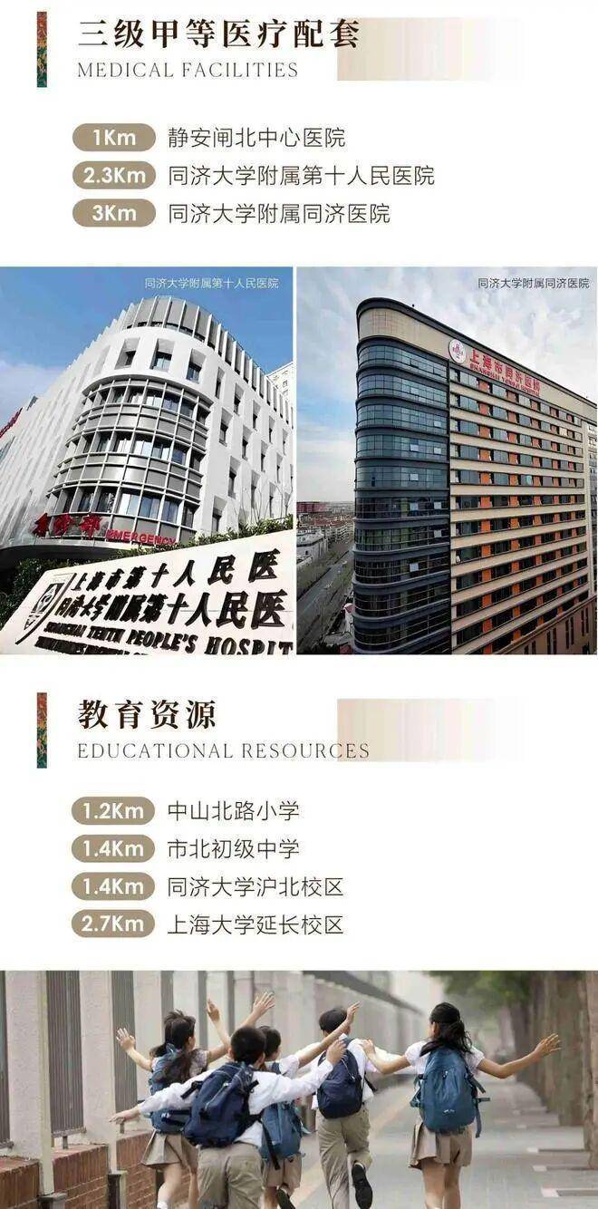 医疗配套:静安闸北中心医院,同济大学附属第十人民医院,同济大学附属同济医院。教育资源:中山北路小学,市北初级中学,同济大学沪北校区,上海大学延长校区。
