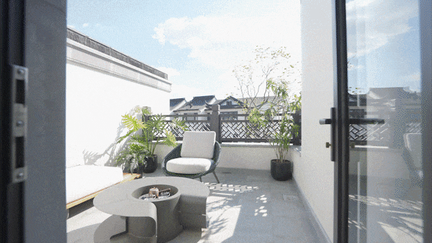经过中心园林之后,就是通往“家”的江南巷道。白色的墙、翠绿的竹,阳光投射下来与竹林形成影影绰绰的光斑投射在墙面,美不胜收。