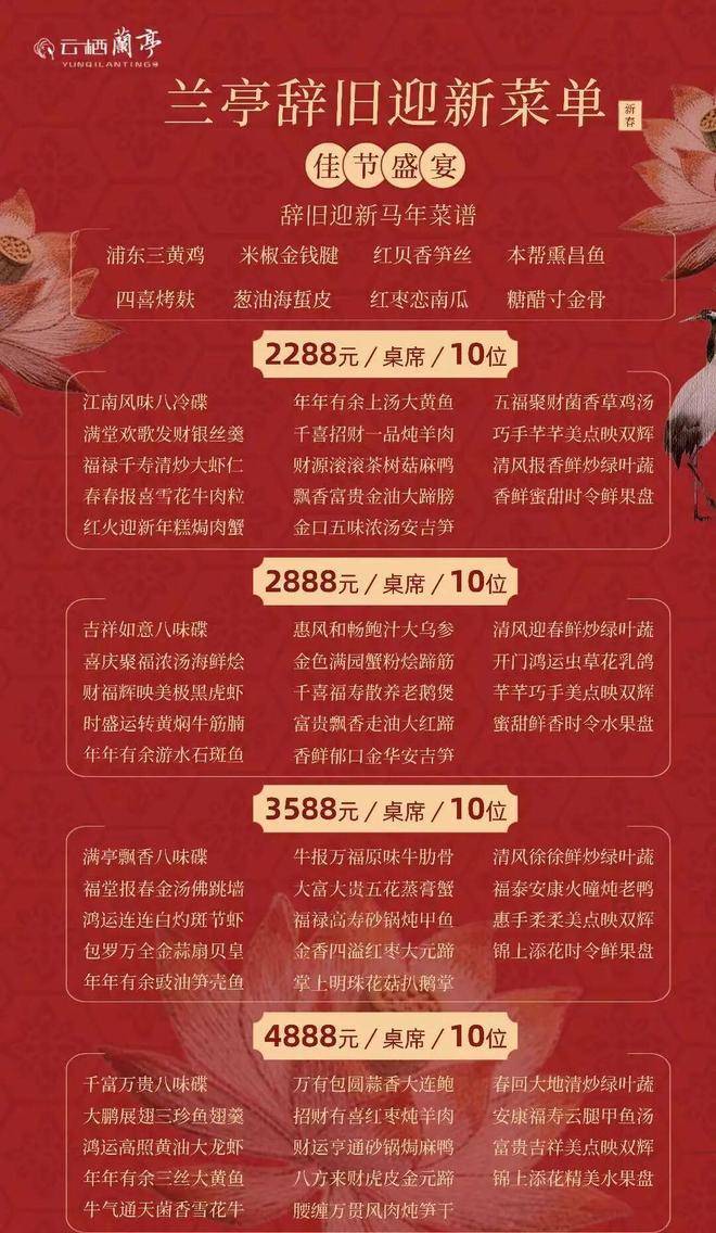随着元旦、春节的临近,云栖兰亭的餐饮团队又开始忙碌起来,精心研究多款年夜饭套餐。这些套餐不仅注重菜品的质量和口味,还考虑到价格因素,做到物美价廉。年夜饭套餐中既有传统的经典菜品,如本帮熏昌鱼、油焖大虾、走油大红蹄等,也有结合现代饮食理念和养生需求的创新菜品,如三珍鱼翅羹、金蒜扇贝皇、虎皮金元蹄等,为长者及其家人们带来全新的味觉体验,度过一个温馨、愉快的节日。