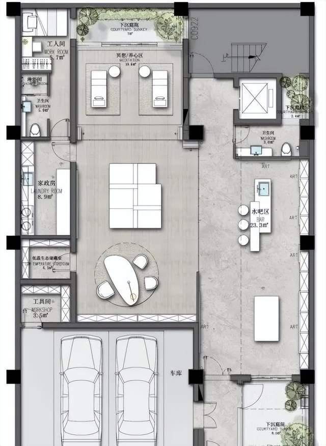这是一处室内挑高6米的地下室客厅,同时拥有下沉式花园和采光天井。