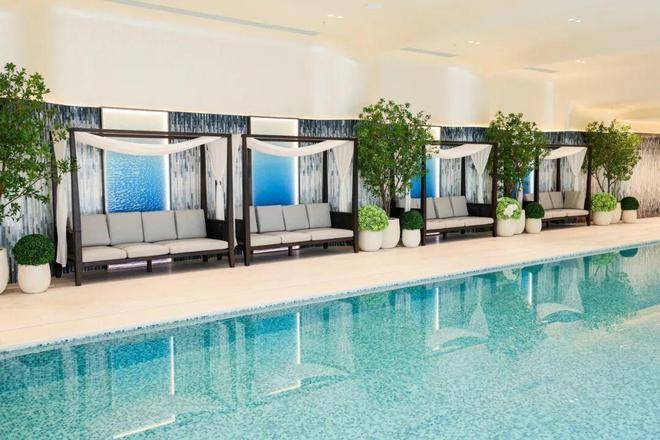 下沉式庭院内,“琉璃光院“主题水景灵动流转,搭配蓝金色调的恒温泳池、私属健身房与行政酒廊,让“海派奢华”不再是想象中的概念,而是可触摸的生活场景。