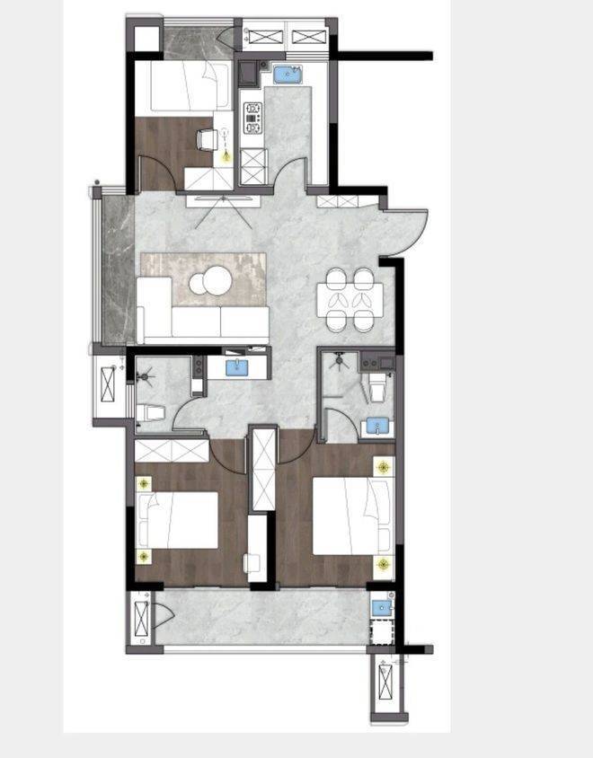 105-110㎡3室2厅2卫:三开间朝南,餐客一体连通阳台,满足改善家庭的空间需求