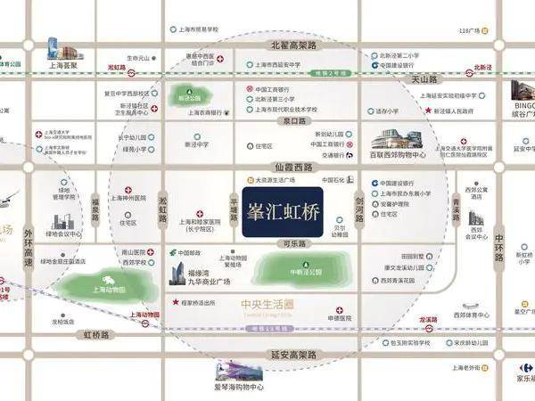 项目隶属长宁区西郊板块,毗邻 中山公园、古北、虹桥商务区。区域生活配套醇熟,地理优势明显。