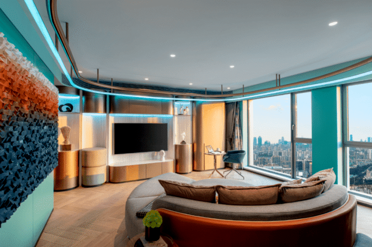 设计师打通原有户型的多余墙体,将其打造为斜杠青年的世界,将全落地玻璃窗、层高3.3米的户型优势发挥到极致。