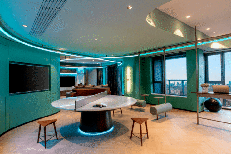 还有吧台、休闲洽谈区、共享会议和健身等功能区,是一个适合交友、会客、休憩、工作、读书、赏景的多功能空间.处处可见的时尚元素,符合当下年轻一代喜好。