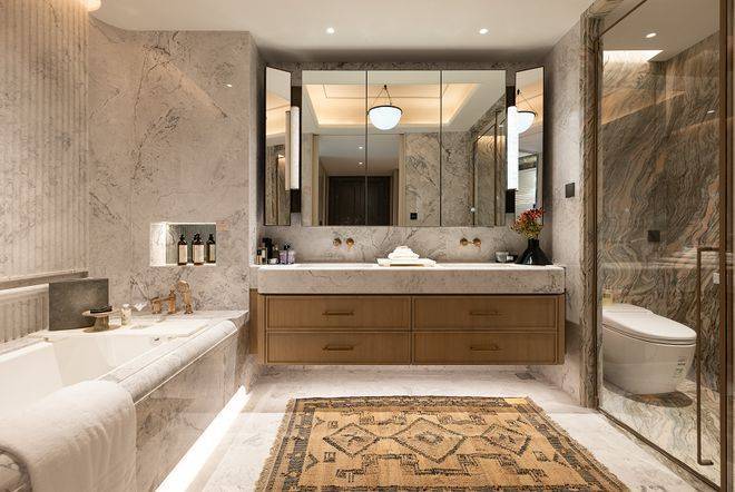正对玄关的位置是主卫,地面墙面为巴西鱼肚灰,淋浴间为水云纱。 五金品牌为GESSI,浴缸及智能马桶品牌为劳芬,定制镜柜里面配有美妆冰箱。