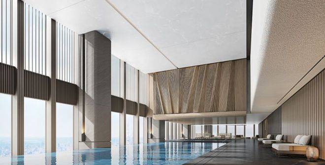绿地外滩中心还以国际高标准打造了无边泳池,这里也是 外滩最高的无边泳池 。在高空中沉浸式享受游泳的乐趣,透过超大的落地窗户,还能欣赏到黄浦江的风光。