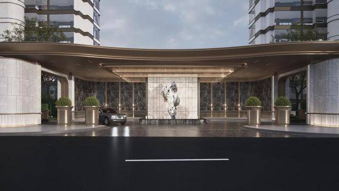 主出入口整体长约30米,进深约23.5米,将顶部廊架扩展到到中岛以外,彰显大气的特色。挑高金属雨棚采用极细边,中间凿壁采用透光奢石,搭配极具现代主义的雕塑彰显小区档次,背景墙面采用维多利亚黑大理石,奢华且低调。
