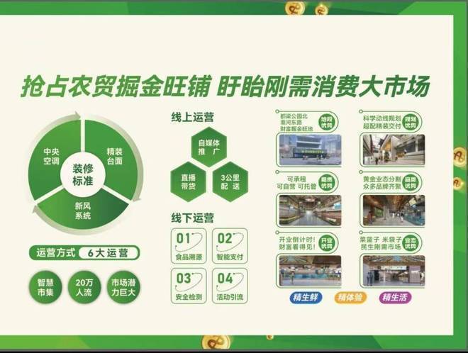 产品优势:摊位面积5㎡-7㎡,根据商家要求定制化摊铺标准,完全满足各类客户投资或自营需求
