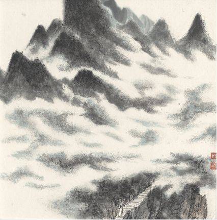 在他的画面中,“三远法”被赋予了新的空间意涵。高远的巍峨、平远的开阔与深远的幽邃,在墨色的层层积染与虚实的精心经营中,生发出既合古法、又具当下视觉经验的“心象”山水。宿墨的沉厚与清墨的透亮在他的笔下相映成趣,山石之阴晴向背、云气之聚散开合,皆在笔踪与墨韵的渗化中自在显现。