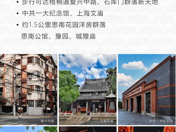 人文:步行可达梧桐道复兴中路,石库门群落新天地,中共一大纪念馆,上海文庙,约1.5公里思南花园洋房群落,思南公馆,豫园,城隍庙等。