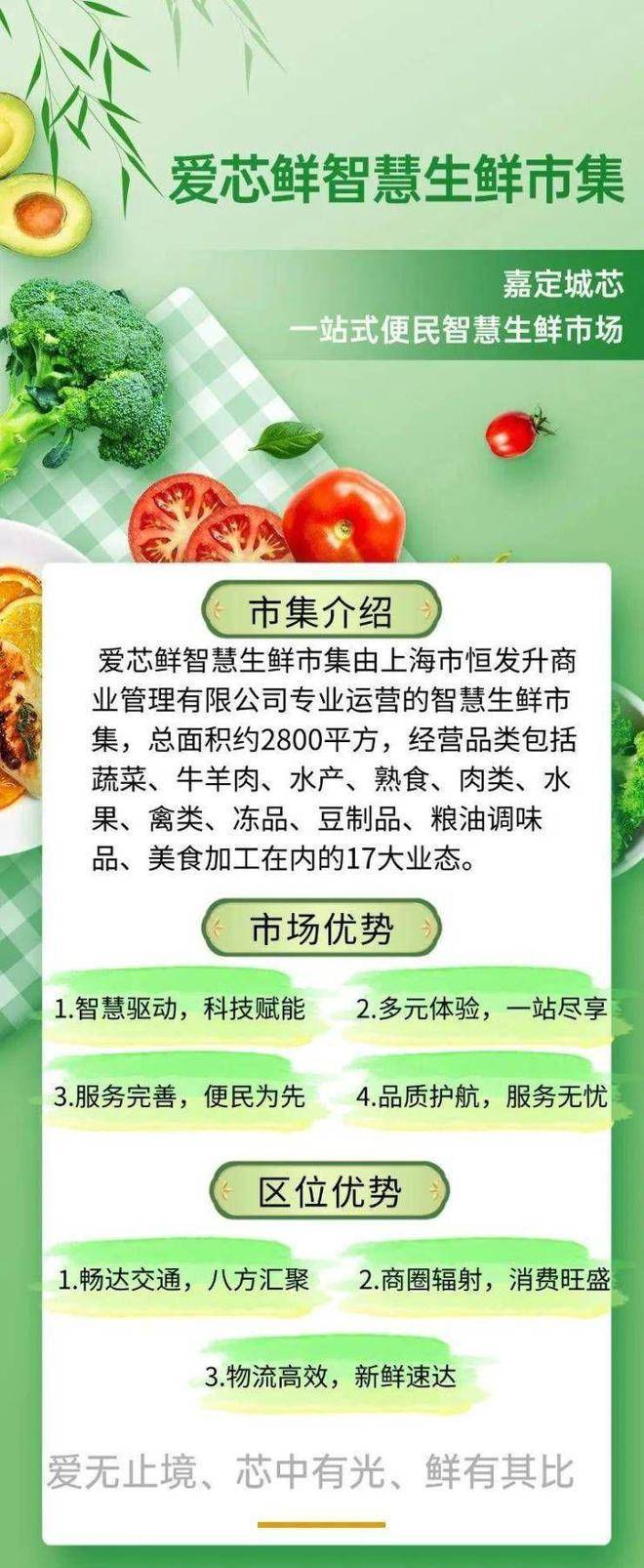 新鲜!优质!安全!爱芯鲜坚持以食品安全为中心充分发挥市场保供稳价的作用把各类绿色健康的瓜果蔬菜搬到家门口让“菜篮子”拎出幸福感!