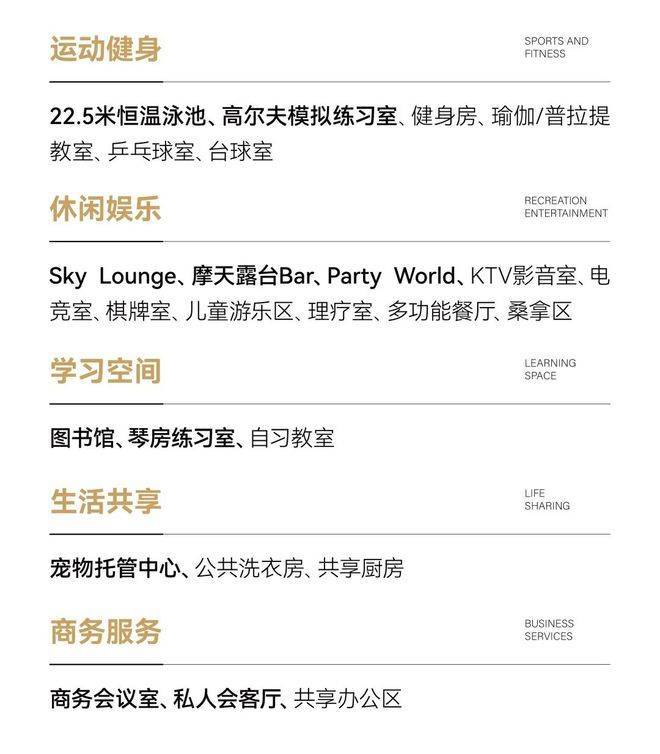 五大功能体系,融合运动健身、休闲娱乐与商务服务空间, 为精英阶层呈现一种无与伦比的生活方式,尽享奢华与尊贵。
