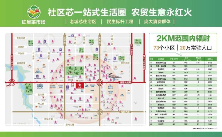 辐射范围:项目核心辐射 2 公里范围内覆盖 108 个大型社区及约 25 万常住人口,周边密集分布有餐饮店、写字楼及商业综合体 。