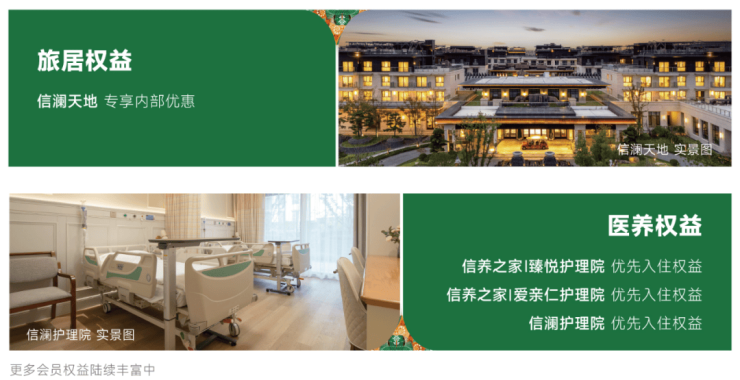 同时还充分利用地产养投和中信养老的资源优势,拉通内部资源,为长者提供从文旅到医护的更多资源。比如中信信澜天地旅居专属优惠、信养之家各护理院优先入住权等等。