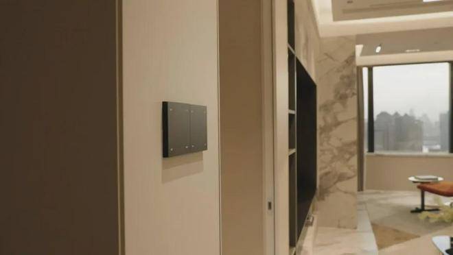 整体设计风格现代简约,搭配夜空黑的日内瓦系列面板、盈趣智能屏等智能设备,以现代设计语言装饰墙板