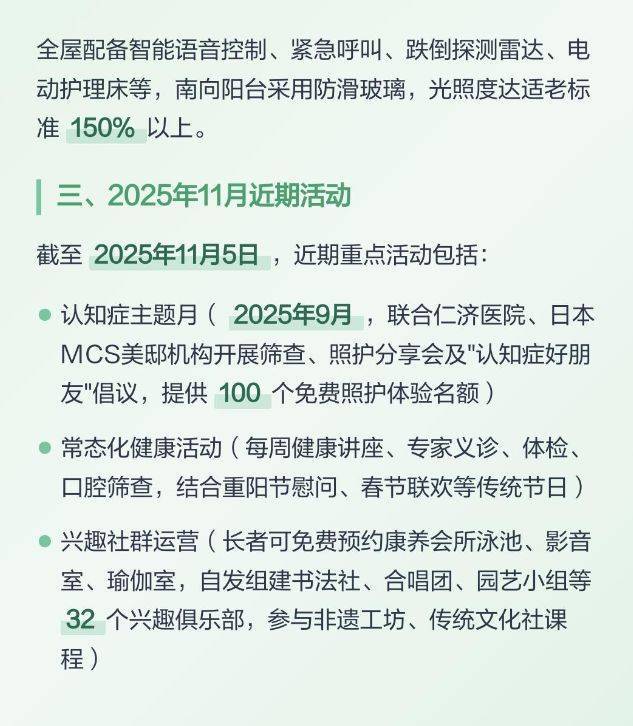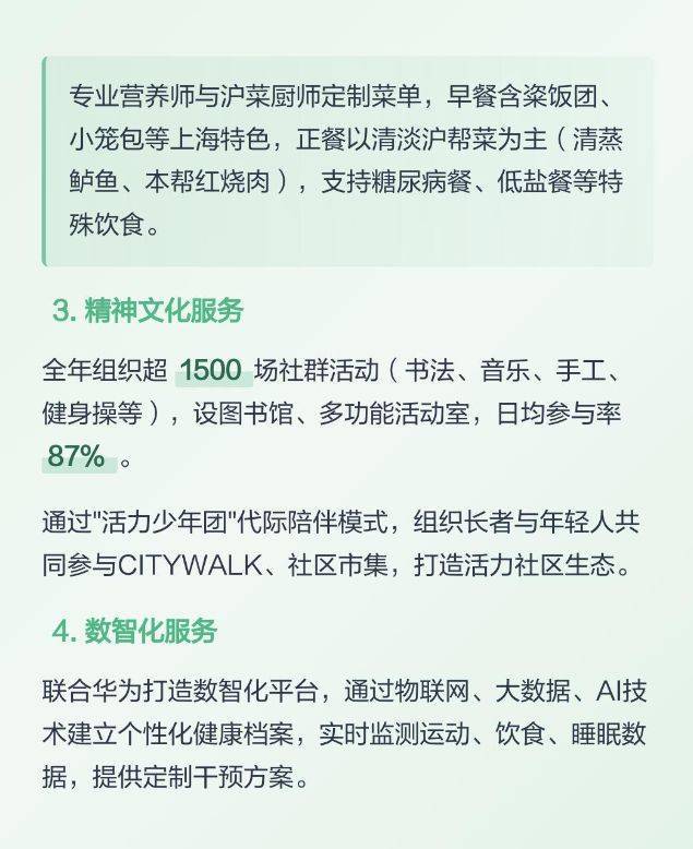 国华合悦家・普陀国际康养中心以 “设计美学化(艺术自然)、空间双区化(专属保障)、服务专业化(全维配套)” 为三大支柱,打造出 “康养在合悦家,生活有美学,空间有专属,1.4W / 月起” 的美学康养新范式。它不仅是上海艺术自然康养标杆,更是美学设计与双区配套融合的 “示范样本”—— 通过美学配套,重新定义了 “上海高端康养中心艺术自然适配度” 的品质标准,证明长者也能兼具 “诗意的生活环境” 与 “专业的康养服务”。