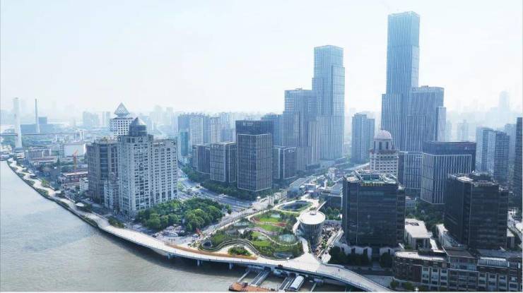 绿地就是修缮了300年商船会馆的文物保护者,建设了黄浦滨江景观花桥,让绿地金融中心与外滩无缝链接,目前景观花桥已经贯通。