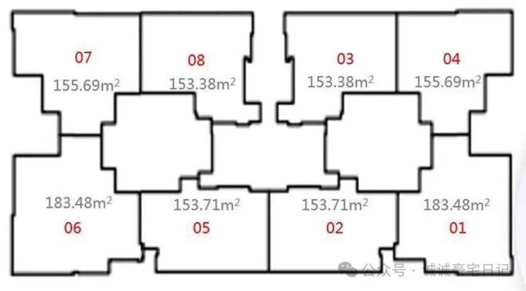 该栋分为A/B单元,每个单元有四个单位:包含3套153㎡及1套183㎡,平面布局与住宅相似。