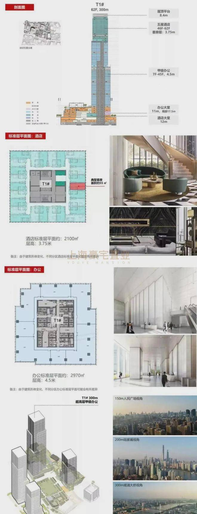 规划300米超高层塔楼上部46-62层为五星级酒店、中部7-45层为甲级办公,底部为商业及大堂。