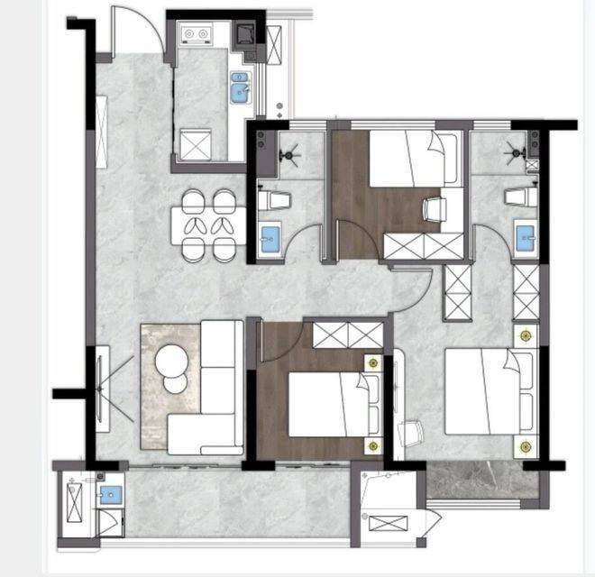 105-110㎡3室2厅2卫:三开间朝南,餐客一体连通阳台,满足改善家庭的空间需求
