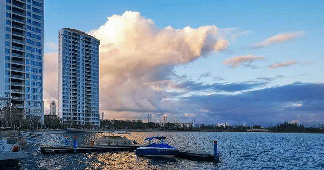 落日时可挽着爱人,一边漫步湖畔遛娃遛狗,一边看天边余霞成绮,湖中碎光点点,人与自然融为一体。