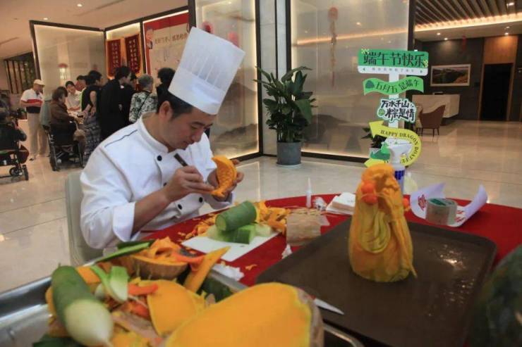 踏入兰亭会所,首先映入眼帘的是,精湛的瓜果雕刻表演。厨艺大师凭借娴熟快捷的刀工与别出心裁的创意,将西瓜、哈密瓜、萝卜等时令鲜果,雕琢成“花开富贵”“龙舟鲤鱼”“太上老君”等栩栩如生的吉祥图案,高超的技艺令人点赞,为端午佳节增添了浓郁喜庆氛围。