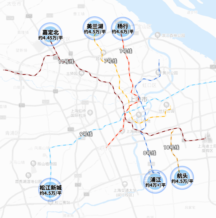 据最新统计,目前上海能通勤传统中央商务区的地铁线, 远郊终点站的新房单价几乎全部超过4万,大多数在4.5万左右!