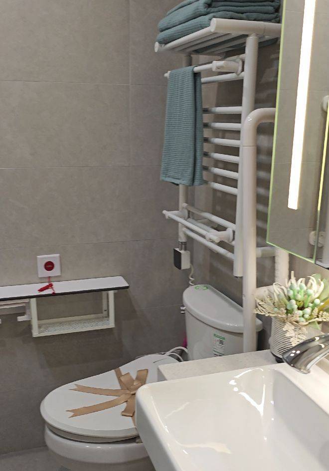 室内都采用适老化设计,比如橱柜、茶几高度的设置,符合老年人的身高和拿取便捷性;家具的倒圆角处理;全屋无障碍设计没有高差;有扶手的床;卫生间的扶手;全屋各处都有紧急呼救铃;防滑材质等,非常人性化。