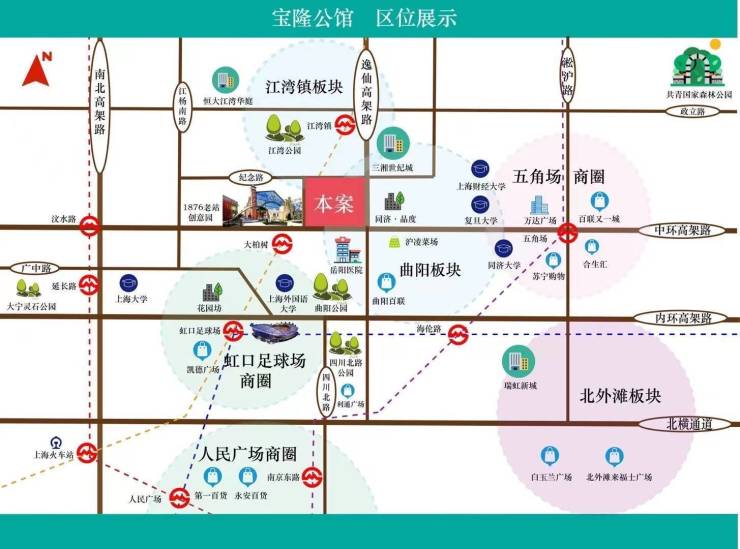 商业配套:项目400米有菜市场。项目往南1km即到曲阳百联购物中心,包含餐饮、银行、服装等业态;项目距离五角场商圈约3公里,逛街购物、休闲下午茶、看电影的首选之地;往西3公里可到凉城商业广场。