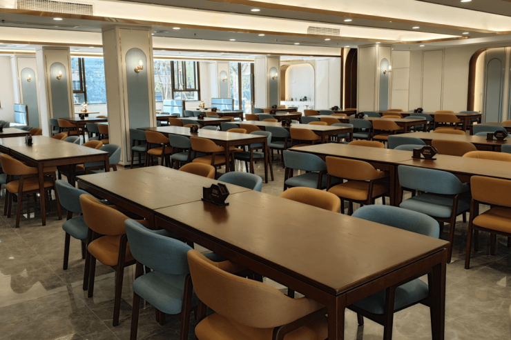 室内空间充分体现适老化细节:全屋无高差设计、防滑地砖、扶手系统、紧急呼叫装置覆盖所有区域;智能设备如智能床垫(监测呼吸)、智能药盒(定时提醒)、恒温花洒及地暖系统,兼顾安全与舒适。单人间增设空气净化系统与私人观景阳台,室内噪音控制低于35分贝,为长者营造静谧的休憩环境。