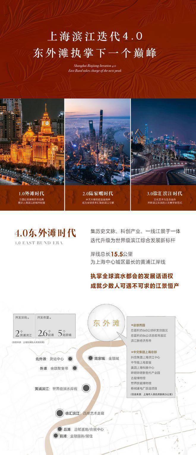 【滨江4.0时代】总体开发面积高达800万方滨江1.0外滩时代➡️滨江2.0陆家嘴时代➡️滨江3.0徐汇滨江时代滨江4.0杨浦滨江时代—集历史文脉、科创产业、一线江景于一体,迭代升级为世界级滨江综合发展新标杆。